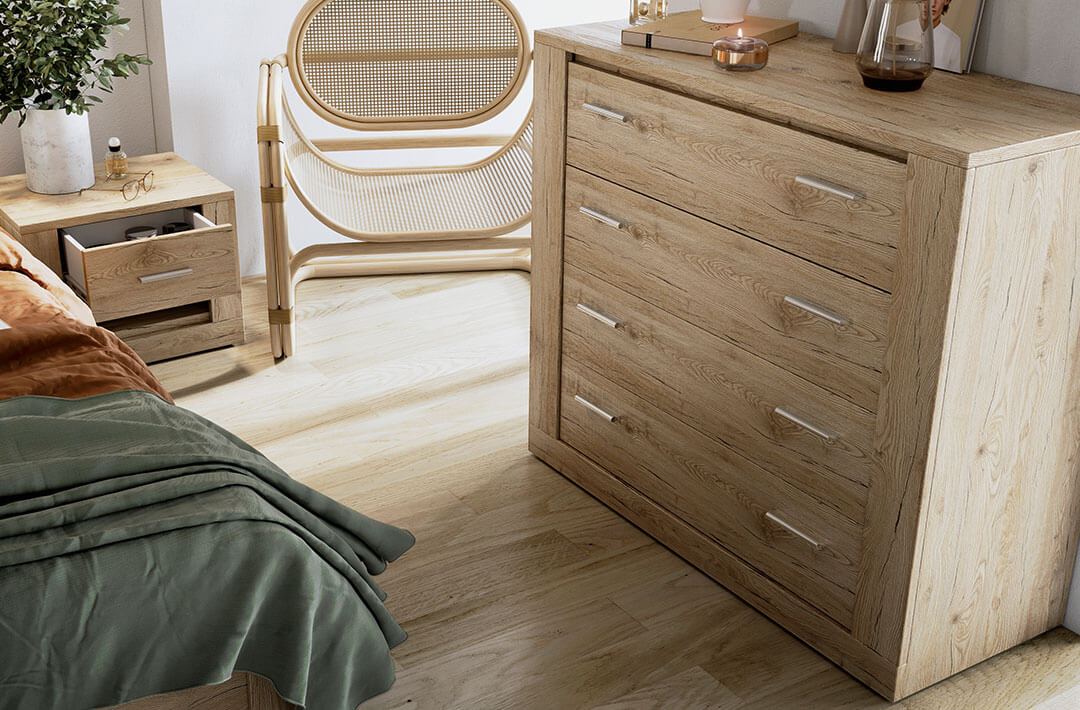 Nowoczesne komody do sypialni to jedne z najchętniej wybieranych mebli do przechowywania. Komody z kompletu mebli do sypialni są eleganckie i wygodne codziennym użytkowaniu. Posiadają pojemne szuflady lub zamykane szafki, w których mieści się odzież, dokumenty czy inne przedmioty. Blat komody to natomiast znakomite miejsce do wyeksponowania dekoracji – ramek ze zdjęciami, pamiątek z wakacji, kwiatów czy eleganckich przedmiotów.