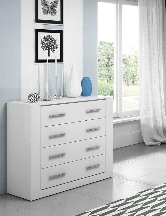Komoda z czterema szufladami w uniwersalnym stylu, który pozwala elastycznie dopasować mebel do różnych stylów wykończenia wnętrza. W pojemnych szufladach wygodnie przechowasz bieliznę, dodatki, a także dokumenty.