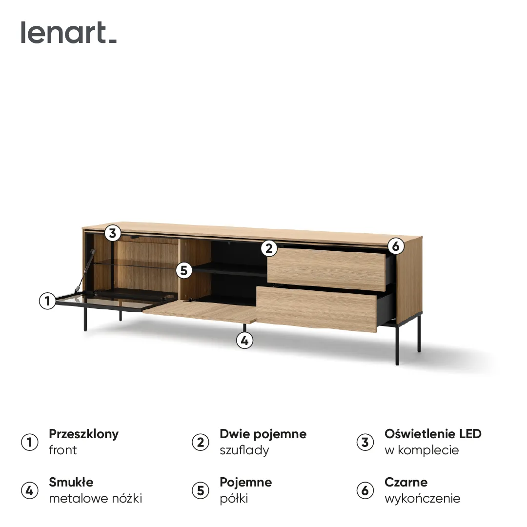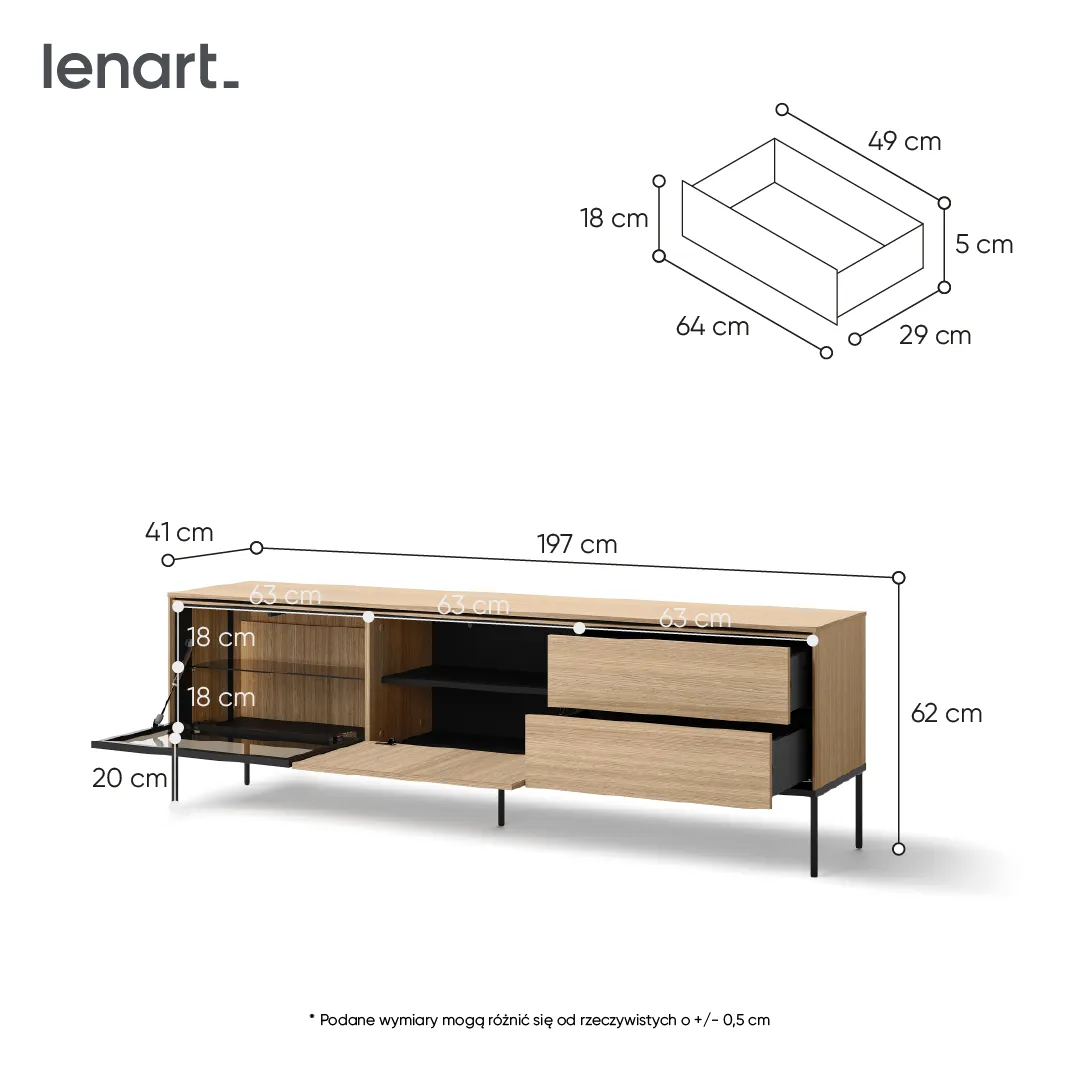 Nasza komoda RTV dąb została zaprojektowana z myślą o wygodzie użytkowania. Wyposażona w pojemne półki i szuflady, oferuje mnóstwo miejsca na przechowywanie sprzętu multimedialnego, akcesoriów oraz innych przedmiotów codziennego użytku. Dodatkowo, odpowiednie rozplanowanie przestrzeni ułatwia organizację kabli, co pozwala utrzymać porządek i estetyczny wygląd wnętrza.