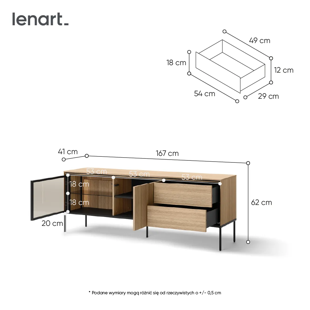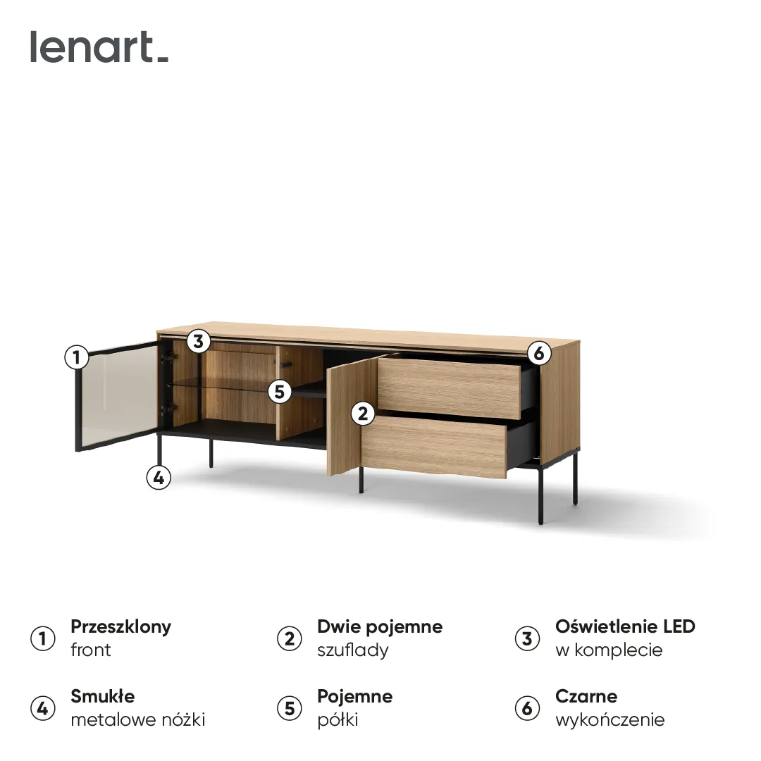 Komoda RTV została zaprojektowana z myślą o Twojej wygodzie. Posiada przestronne półki i szuflady, które pomieszczą cały sprzęt multimedialny – telewizor, odtwarzacz, konsole, a także kable, piloty i inne akcesoria. Dzięki temu wszystkie elementy Twojego centrum rozrywki będą zawsze na swoim miejscu, a Ty będziesz mógł cieszyć się porządkiem i łatwym dostępem do wszystkiego, czego potrzebujesz.