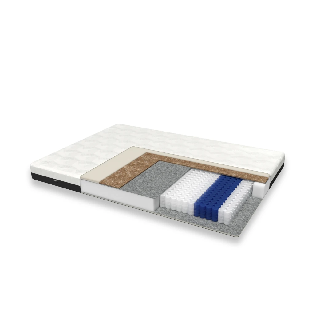 Responsywna pianka termoelastyczna Visco (technologia opracowana przez NASA), precyzyjnie dopasowuje się do kształtu ciała. Ogranicza nacisk na tkanki, poprawia krążenie i zwiększa komfort snu. Pokrowiec ELITE Cover wykonany został z wysokiej jakości dzianiny z dodatkiem wiskozy — miękki, antyalergiczny i przewiewny. Zamek 360° umożliwia łatwe zdejmowanie, a pranie w 30°C ułatwia utrzymanie higieny. Pokrowiec posiada Certyfikat Oeko-Tex. Warstwa kokosowa podnosi twardość i wytrzymałość materaca. Wkład kieszeniowy (272 sprężyny, 7 stref nacisku) zapewnia odpowiednie podparcie, a wzmocnione krawędzie chronią przed odkształceniami. Pianka poliuretanowa (25 kg/m³) jest odporna na deformacje, dobrze przepuszcza powietrze i zapewnia izolację termiczną.