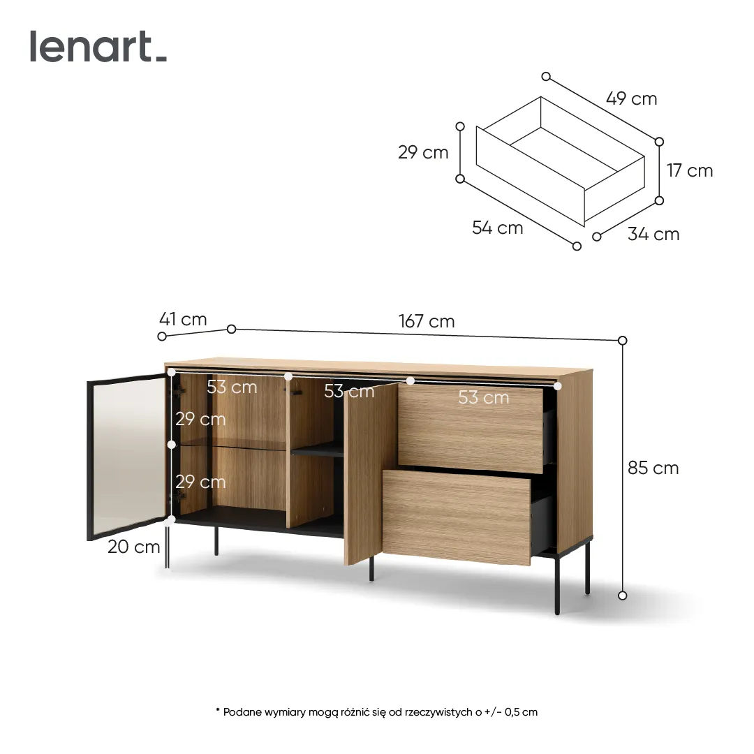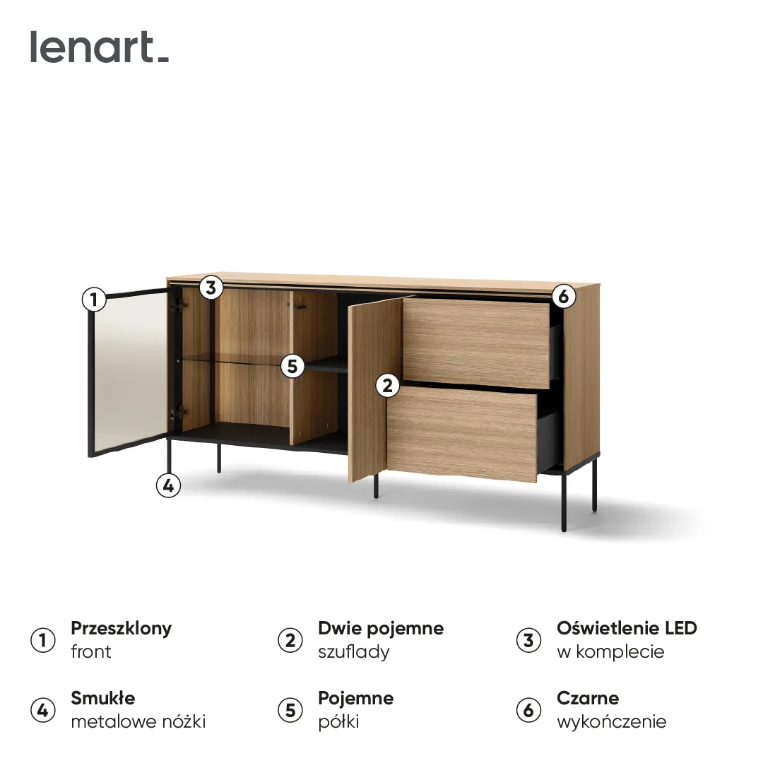 Nasza modna komoda do salonu została zaprojektowana z myślą o nowoczesnych wnętrzach, w których liczy się elegancja i funkcjonalność. Wyróżnia się minimalistycznym, ale jednocześnie wyrafinowanym designem, który doskonale komponuje się z różnymi stylami aranżacyjnymi – od skandynawskiego, przez loftowy, aż po klasyczny. Dzięki starannie dobranym materiałom i perfekcyjnemu wykończeniu, komoda stanowi wyjątkowy element dekoracyjny, który przyciąga wzrok.