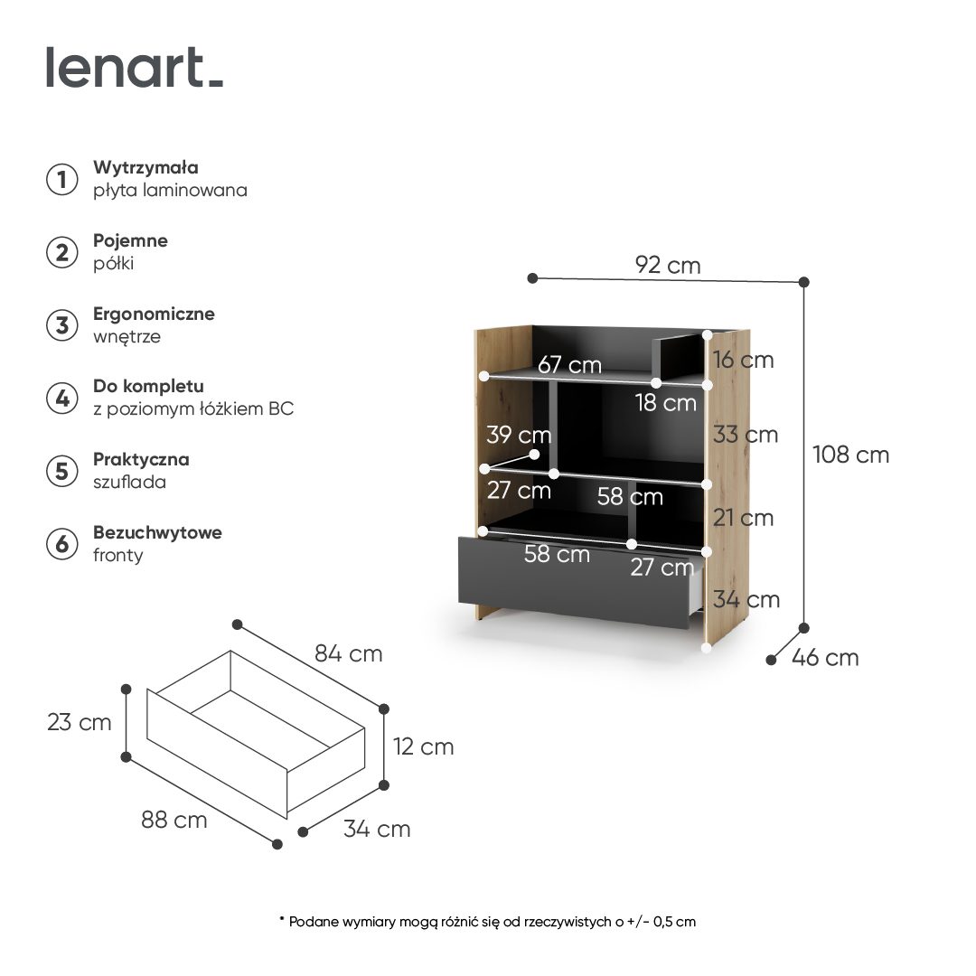 Szukasz praktycznego, modnego i eleganckiego sposobu na przechowywanie swoich ulubionych pamiątek i dodatków? Mamy dla Ciebie idealne rozwiązanie – regał na książki BC-25! Ten piękny, ale zarazem funkcjonalny mebel został zaprojektowany z myślą o posiadaczach półkotapczanu BC-06, którzy są miłośnikami prostoty i minimalizmu. Regał składa się szuflady i kilku półek z przegrodami, które umożliwiają przechowywanie różnorodnych przedmiotów, w tym książek, figurek, bibelotów, pamiątek i innych drobiazgów. Dzięki temu jest doskonałym sposobem na organizację przestrzeni w Twoim domu, a jednocześnie wprowadza do niej przytulny i stylowy klimat. Dodatkowo, regał jest dostępny w kilku wersjach kolorystycznych, dzięki czemu z łatwością dopasujesz go do swojego stylu i gustu.