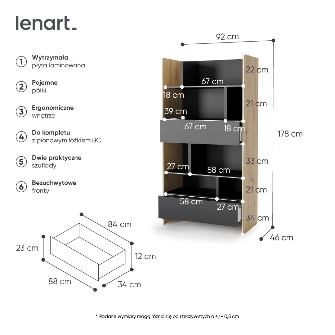 Poszukujesz rozwiązania, które pozwoli Ci praktycznie i estetycznie zagospodarować przestrzeń przy łóżku? Mamy dla Ciebie idealną propozycję – regał BC-28! Ten mebel został zaprojektowany z myślą o półkotapczanach BED CONCEPT pod materac o szerokości 160 cm i orientacji poziomej. Dzięki niemu zyskasz dodatkową powierzchnię do przechowywania swoich ulubionych lektur, dekoracji i innych drobiazgów, a jednocześnie stworzysz w sypialni przytulny nastrój. Regał posiada dwie pojemne szuflady oraz półki z przegrodami, co sprawia, że jest bardzo funkcjonalny i pozwala na wygodne przechowywanie wszystkich niezbędnych rzeczy. BC-28 dostępny jest w aż 3 wersjach kolorystycznych – sam zdecyduj, która wersja lepiej wpasuje się w Twoje wnętrze!