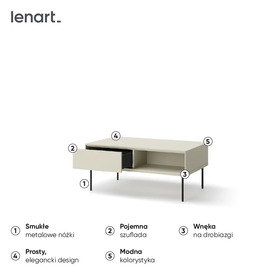 Dlaczego warto wybrać właśnie ten model? Prostokątny stolik kawowy to idealne rozwiązanie dla tych, którzy cenią sobie praktyczne, a zarazem stylowe wyposażenie wnętrz. Pasuje zarówno do przestronnych salonów, jak i mniejszych pokoi dziennych, gdzie liczy się każdy centymetr przestrzeni. Jego uniwersalność sprawia, że z łatwością dopasujesz go do swojej kolekcji mebli z Lenart Meble, tworząc spójną i elegancką aranżację.