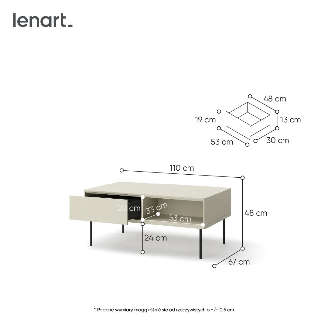 Ten prostokątny stół kawowy wyróżnia się swoim minimalistycznym designem, który idealnie wpisuje się w nowoczesne aranżacje. Dzięki wymiarom 110 x 48 x 67 cm oferuje wystarczająco dużo miejsca na filiżanki kawy, dekoracje czy ulubioną książkę, jednocześnie nie przytłaczając przestrzeni. Jego kształt sprawia, że świetnie komponuje się z sofami i narożnikami, tworząc harmonijną strefę relaksu w Twoim domu.
