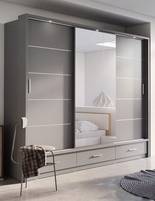 Pojemna szafa z trojgiem drzwi przesuwnych. Na froncie środkowych drzwi znajduje się duże lustro – niezbędny element każdej garderoby. Na dole szafy zaplanowano trzy łatwo dostępne szuflady na bieliznę, dodatki lub inne akcesoria. Wewnątrz znajdziesz dwa drążki na ubrania oraz kilka pojemnych półek. Mebel możesz dostosować do swoich potrzeb, np. umieszczając półki w innych pionach.