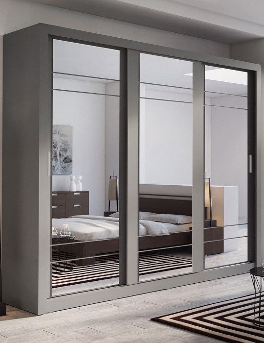 Szafa z trojgiem drzwi przesuwnych oraz z dużymi lustrami na każdym z frontów. Lustra optycznie powiększają i rozjaśniają przestrzeń, pozytywnie wpływają też na wygodę korzystania z mebla. Szafa jest wyposażona w dwa drążki na wieszaki i regał z półkami na ubrania. Na obszernej, górnej półce zmieścisz rzadziej używane rzeczy, obuwie w kartonach lub walizki.