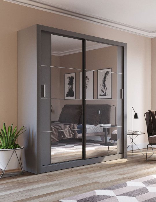 Pojemna szafa z dwojgiem drzwi przesuwnych, idealna do garderoby, sypialni czy przedpokoju. Na frontach znajdują się lustra, które optycznie powiększają przestrzeń, rozjaśniają wnętrze oraz znacząco wpływają na wygodę korzystania z mebla. Wnętrze szafy kryje dwa drążki, na których zwiesisz odzież o różnej długości oraz pięć praktycznych półek. Uniwersalny design oraz dwie wersje kolorystyczne sprawiają, że mebel świetnie dopasuje się do różnych aranżacji wnętrza.