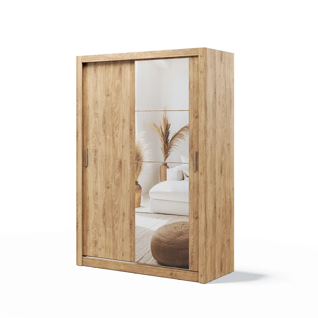 Kompaktowa w wymiarach, wąska szafa z dwojgiem drzwi przesuwnych. Idealnie sprawdzi się w mniejszych pomieszczeniach, np. sypialni, garderobie, przedpokoju czy pokoju młodzieżowym. Lustro umieszczone na jednym z frontów optycznie powiększa przestrzeń. Dzięki dobrze zorganizowanemu wnętrzu szafa pomieści pokaźną ilość garderoby. Wewnątrz znajdziesz drążek na wieszaki (który możesz umieścić w prawym lub lewym pionie szafy oraz głębokie półki. Na górnej półce zmieścisz rzadziej używane rzeczy lub walizki.