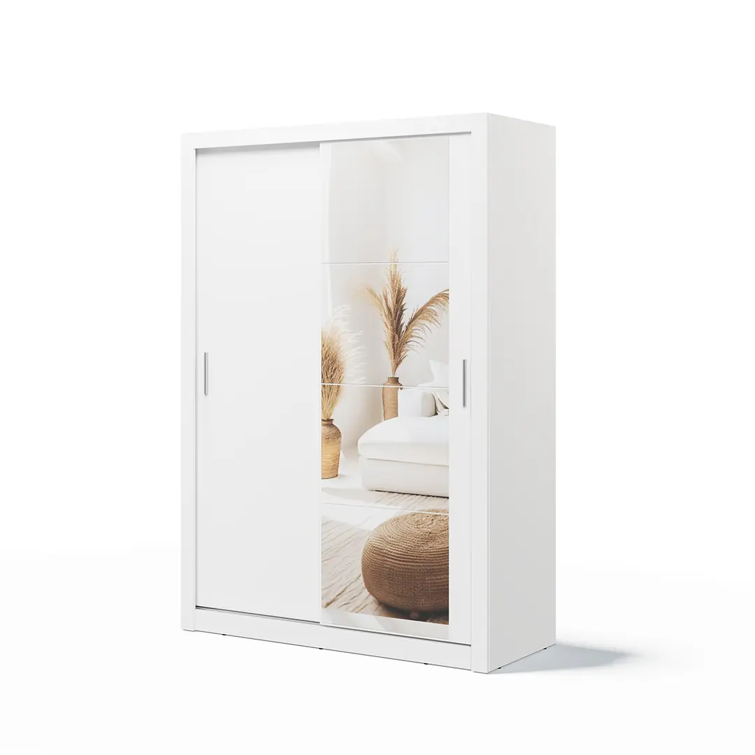 Kompaktowa w wymiarach, wąska szafa z dwojgiem drzwi przesuwnych. Idealnie sprawdzi się w mniejszych pomieszczeniach, np. sypialni, garderobie, przedpokoju czy pokoju młodzieżowym.