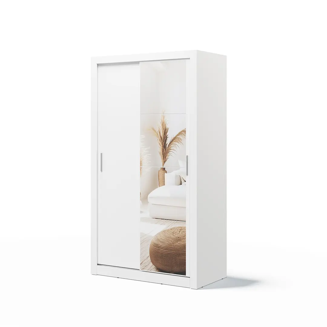 Kompaktowa w wymiarach, wąska szafa z dwojgiem drzwi przesuwnych. Idealnie sprawdzi się w mniejszych pomieszczeniach, np. sypialni, garderobie, przedpokoju czy pokoju młodzieżowym.