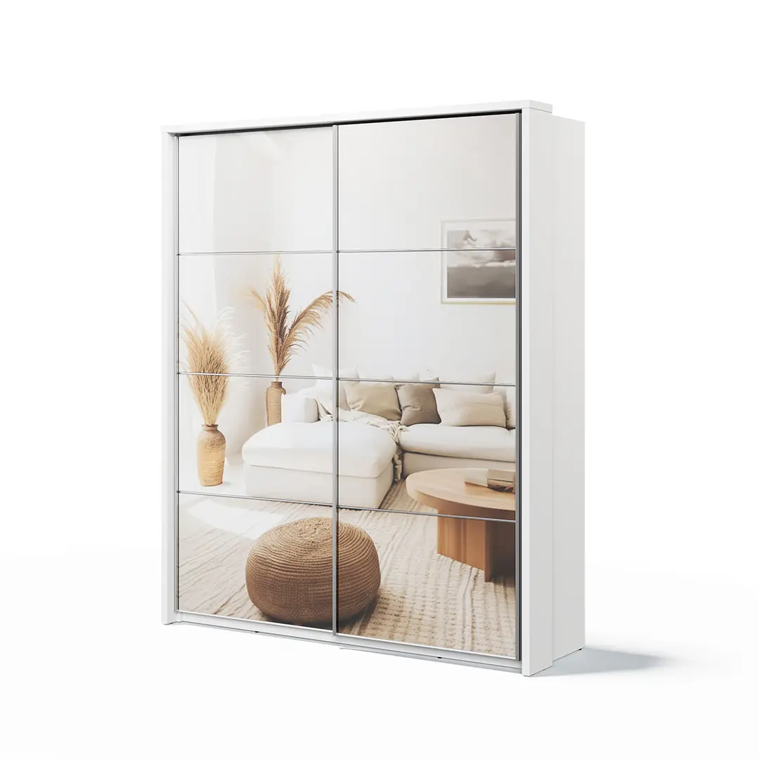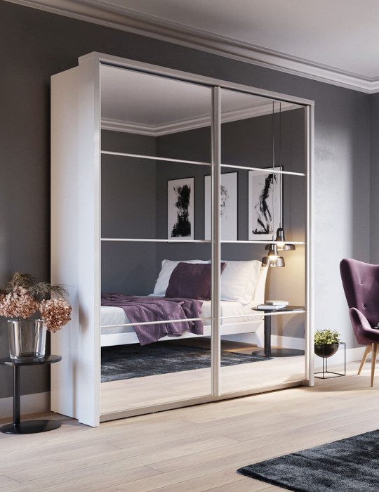 Pojemna szafa z dwojgiem drzwi przesuwnych i ergonomicznym układem funkcjonalnym. Nowoczesny, a jednocześnie uniwersalny styl szafy pozwala na dużą swobodę w aranżacji. Na frontach znajduje się tafla luster, która optycznie powiększa wnętrze, wprowadza do pomieszczenia więcej światła oraz dobrze wpływa na komfort używania mebla.
