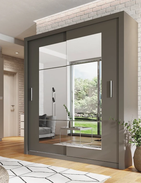 Bardzo pojemna, nowoczesna szafa z dwojgiem drzwi przesuwnych, które świetnie oszczędzają przestrzeń. Idealna do sypialni, garderoby, przedpokoju lub pokoju nastolatki/nastolatka. Modny, a jednocześnie uniwersalny design to zasługa prostej formy oraz sprawdzonych wybarwień, w jakich dostępna jest szafa. Uzupełnieniem jest duże lustro na obu frontach, które optycznie powiększa przestrzeń i pozytywnie wpływa na komfort korzystania z szafy.