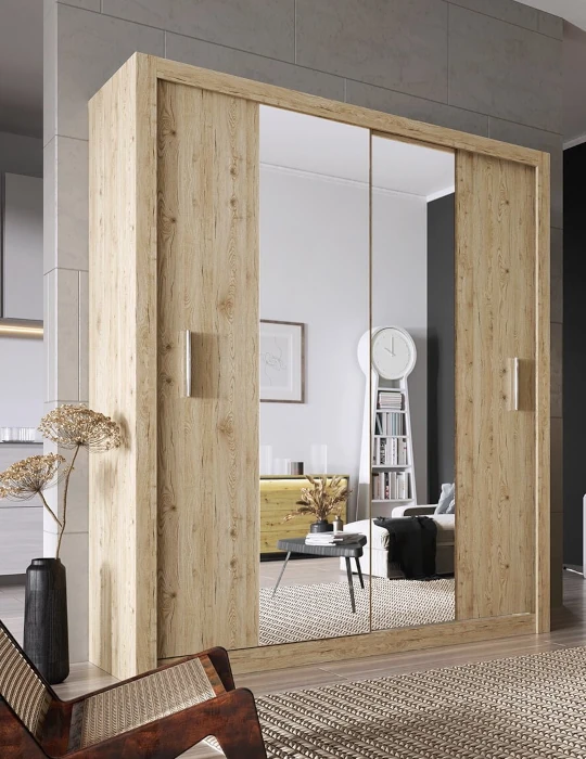 Bardzo pojemna, nowoczesna szafa z dwojgiem drzwi przesuwnych, które świetnie oszczędzają przestrzeń. Idealna do sypialni, garderoby, przedpokoju lub pokoju nastolatki/nastolatka. Modny, a jednocześnie uniwersalny design to zasługa prostej formy oraz sprawdzonych wybarwień, w jakich dostępna jest szafa. Uzupełnieniem jest duże lustro na obu frontach, które optycznie powiększa przestrzeń i pozytywnie wpływa na komfort korzystania z szafy.