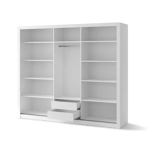 Duża i pojemna szafa z dwojgiem drzwi przesuwnych. Na froncie jednych drzwi znajduje się lustro – niezbędny element każdej garderoby, który jednocześnie optycznie powiększa wnętrza i wprowadza do pomieszczenia więcej światła. Wnętrze szafy kryje przyjazny i funkcjonalny układ – znajdziesz tam drążek na wieszaki oraz dwa wewnętrzne regały z półkami. Szafa dostępna jest w kolorze białym. Mebel wykonano z wytrzymałej płyty laminowanej, wykończonej trwałym obrzeżem ABS.