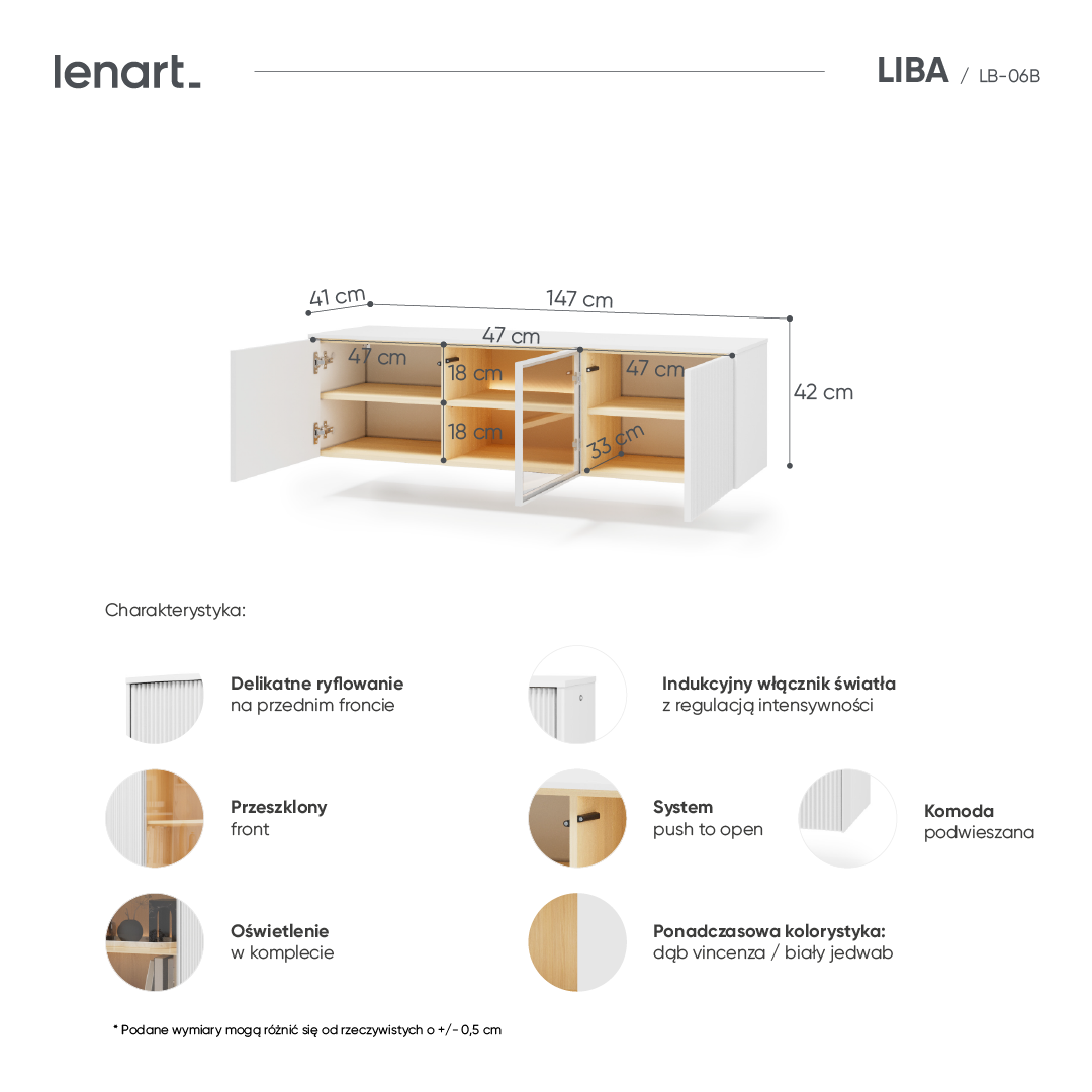 Jeśli chcesz stworzyć stylową i uporządkowaną przestrzeń multimedialną, szafka pod telewizor podwieszana będzie doskonałym wyborem do nowoczesnego salonu. Minimalistyczna forma, jasna kolorystyka oraz subtelne detale sprawiają, że mebel wygląda lekko i elegancko, a jednocześnie zapewnia wygodne miejsce na przechowywanie sprzętu oraz akcesoriów. To rozwiązanie idealne dla osób, które cenią nowoczesny design, funkcjonalność i dopracowane wykończenie. Biała bryła w połączeniu z ciepłym wnętrzem w kolorze dąb vincenza nadaje meblowi przytulnego charakteru, dzięki czemu szafka pod telewizor wisząca doskonale pasuje zarówno do minimalistycznych, jak i bardziej eleganckich aranżacji. Szeroka konstrukcja pozwala stworzyć spójną i estetyczną strefę RTV, która stanie się centralnym punktem salonu.