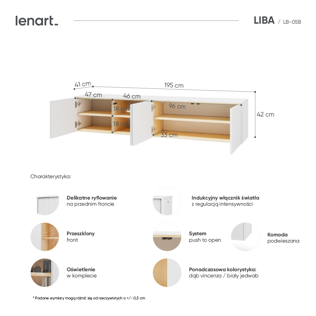 Jeśli szukasz rozwiązania, które pozwoli stworzyć stylową i uporządkowaną przestrzeń multimedialną, wisząca szafka RTV będzie idealnym wyborem do nowoczesnego salonu. Podwieszana konstrukcja, jasna kolorystyka oraz subtelne detale sprawiają, że mebel wygląda lekko i elegancko, a jednocześnie oferuje wygodne miejsce na przechowywanie sprzętu i dodatków. To propozycja dla osób, które cenią minimalistyczny design, funkcjonalność i dopracowane wykończenie. Biała bryła w połączeniu z ciepłym wnętrzem w kolorze dąb vincenza nadaje meblowi przytulnego charakteru i sprawia, że szafka RTV wisząca doskonale pasuje do nowoczesnych aranżacji salonu. Dzięki swojej szerokości świetnie prezentuje się pod telewizorem, tworząc spójną i elegancką strefę wypoczynkową.